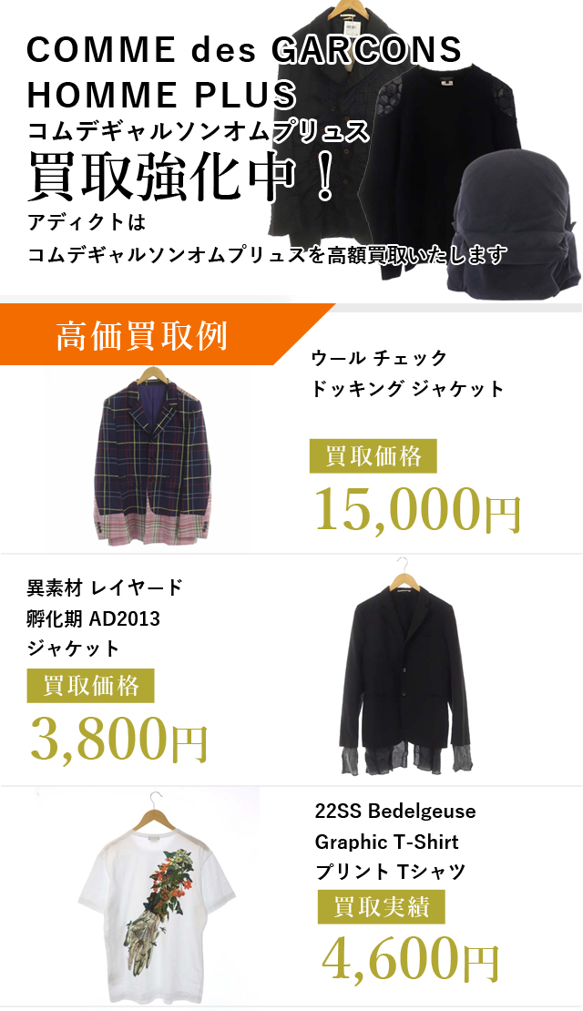 アディクトでは、コムデギャルソンオムプリュスを高価買取中です。日本全国どこからでもご利用いただけますのでお気軽にご利用ください。